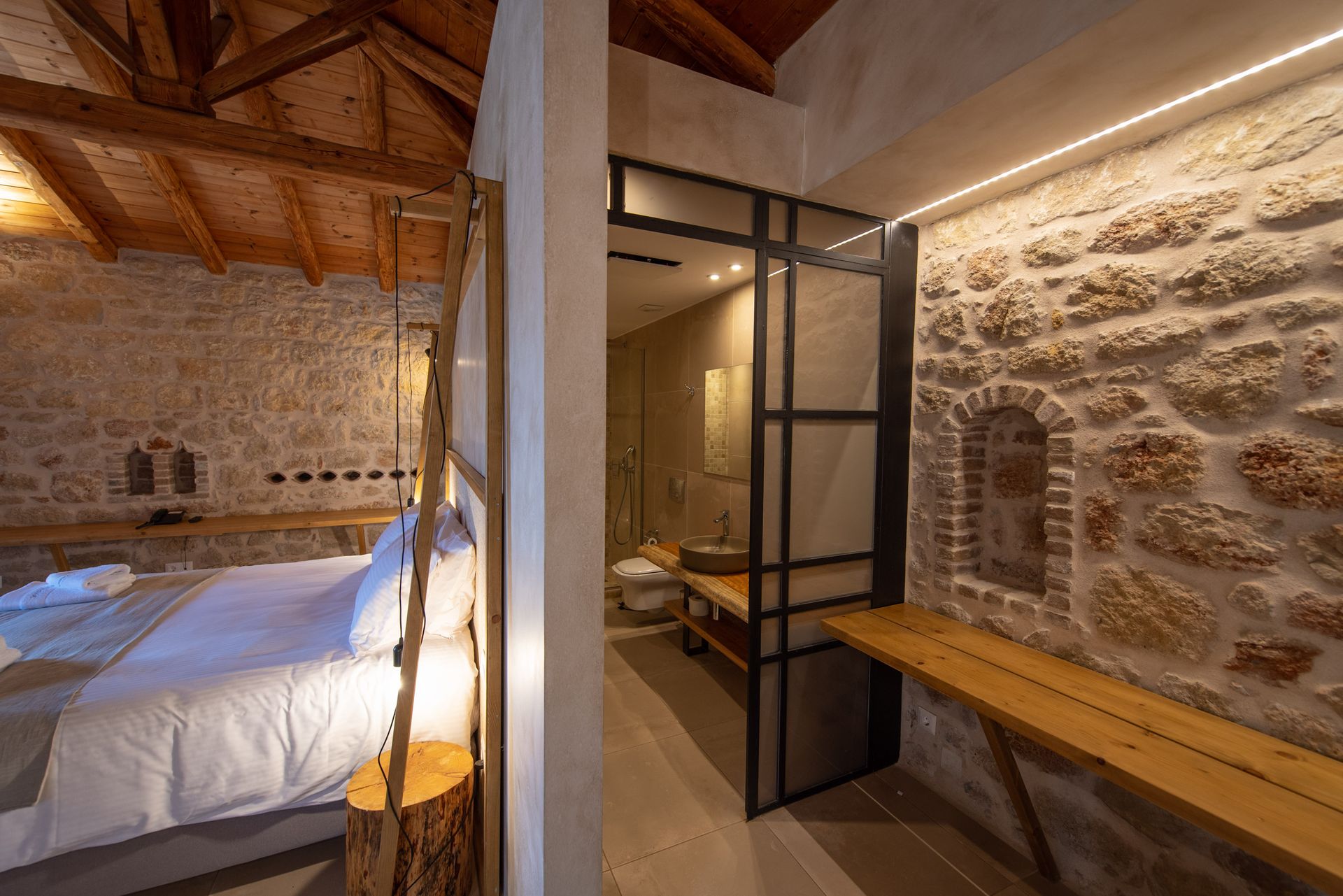Spacious suite in soft tones with traditional stone fireplace. It is characterized by the king size bed and the handmade headboard, as well as the view of the pool and the bay of Neos Itilos.